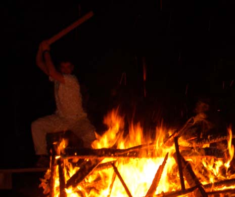 Abe standing triumphant over the fire.